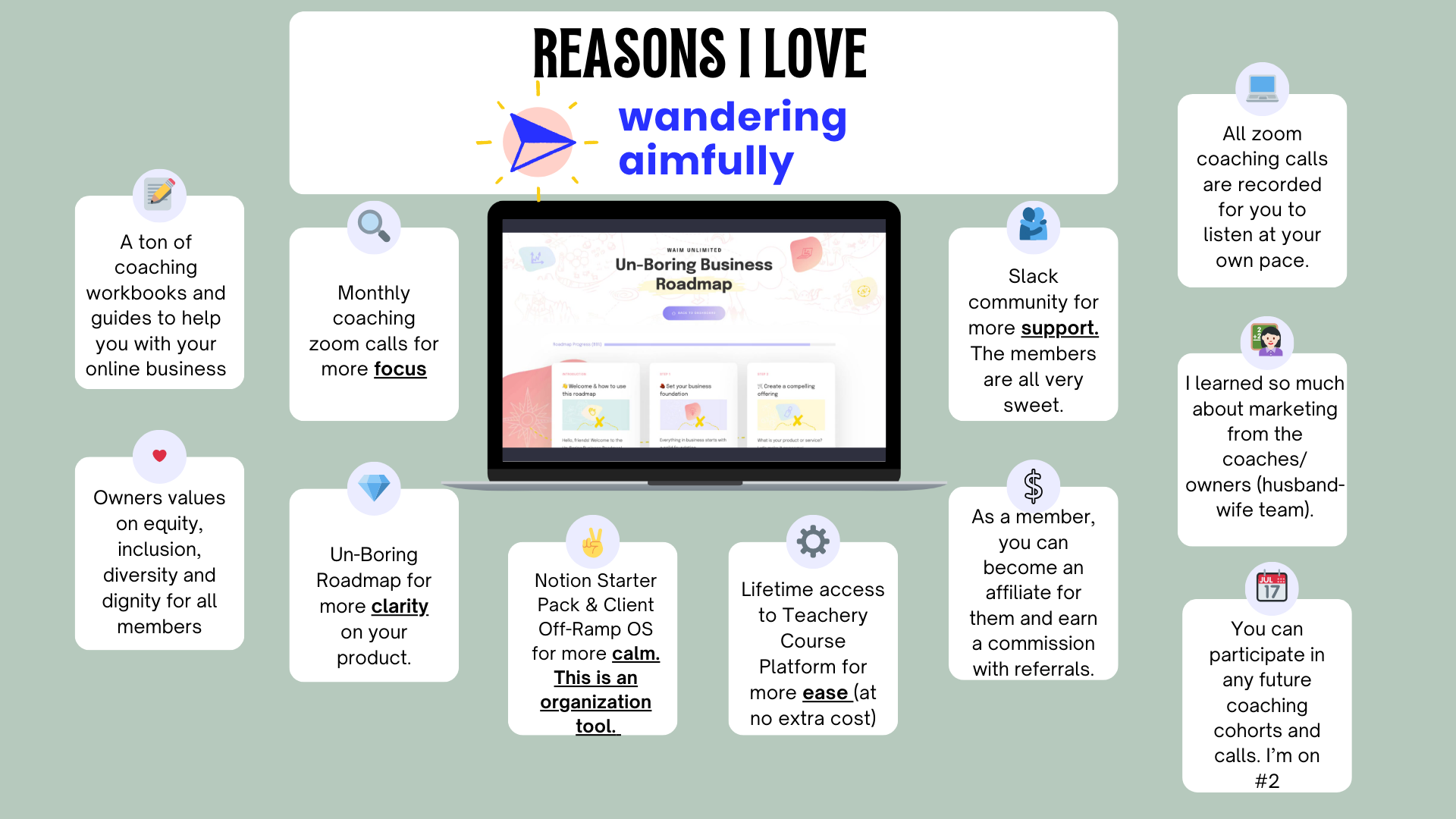 Wandering Aimfully is a coaching program for digital creators. It run by a husband-wife duo dedicated to helping digital creators offer their services in a way that's aligned with their values. This duo highly values inclusivity, equity, diversity and dignity for all members. They also place a strong emphasis on building without burnout with a focus on what it means for your business to offer you enough of what you want. They host monthly training sessions on everything you need to build a sustainable, profitable online business.