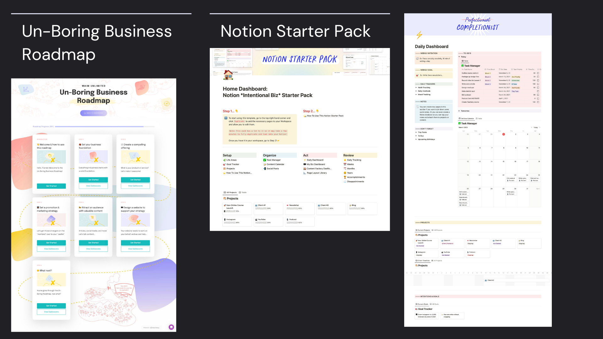 Just a few included tools for your business development. They give βgoogle docs and Notion Starter packs to help you organize and plan out your business strategies. They pair well with their monthly coaching calls (all recorded and accessible βwith lifetime access).